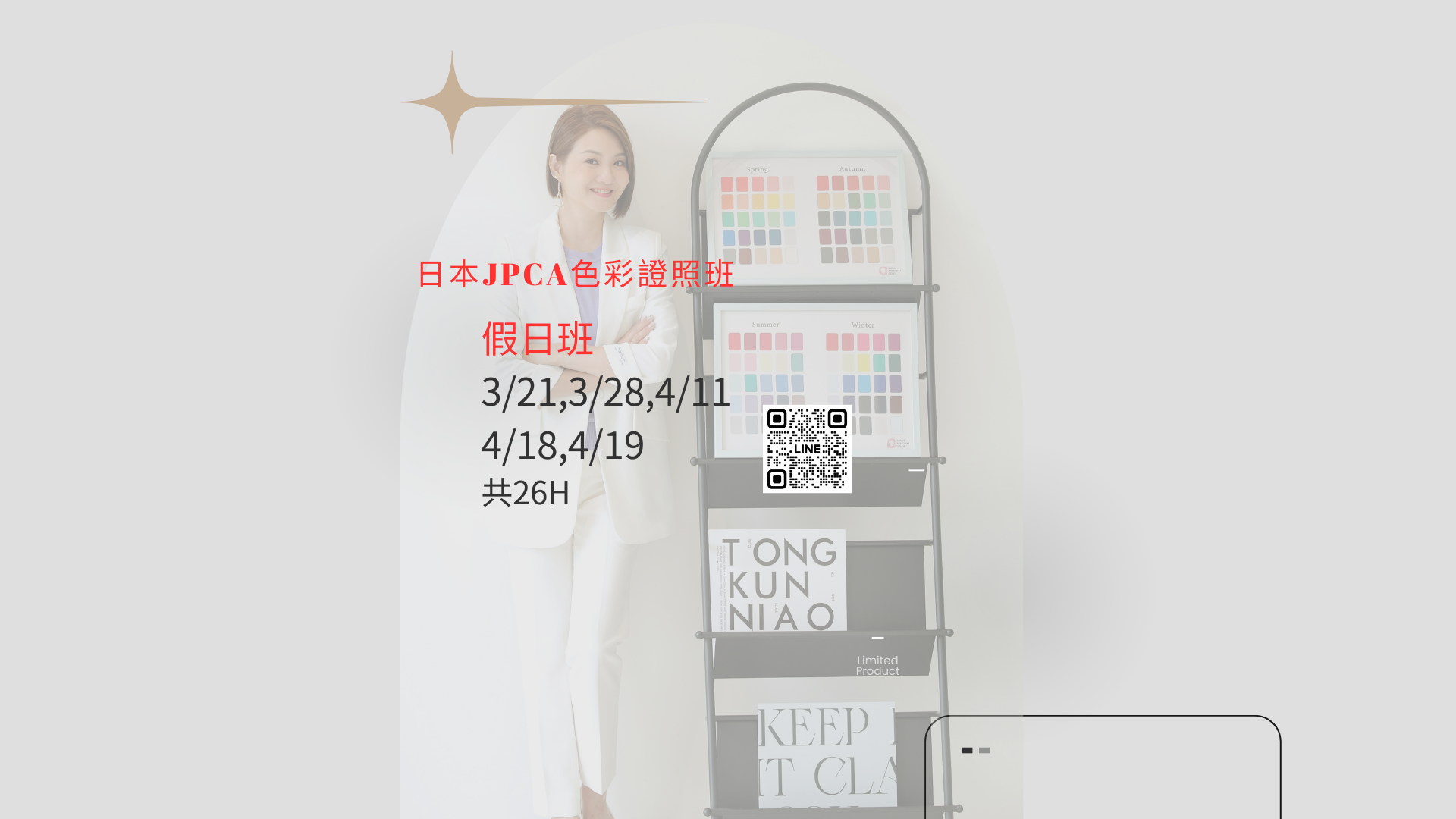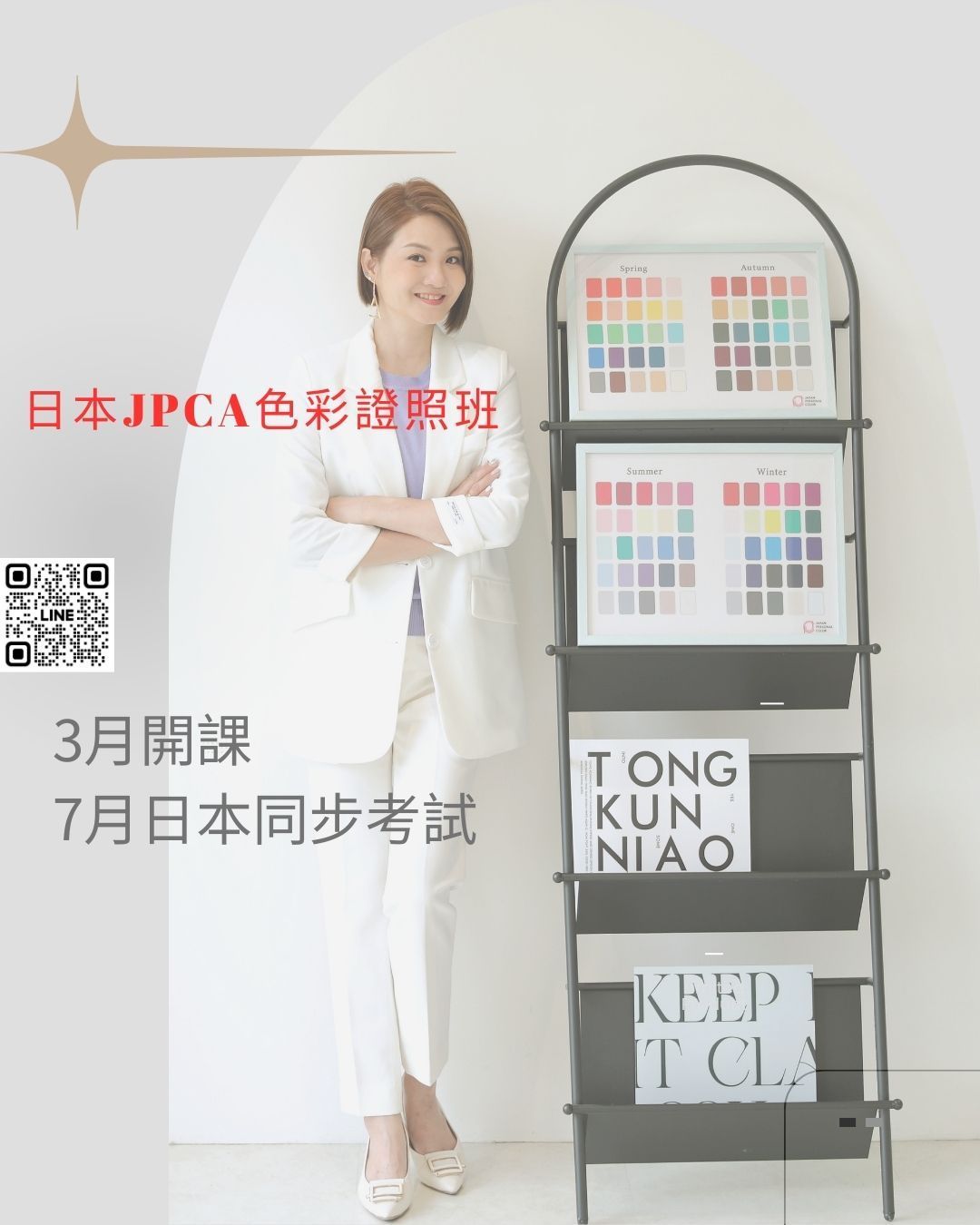 JPCA 日本色彩認證課程 給想要專業進修、取得國際認證的你,一次完整的培訓規劃!時數共26小時 課程日期 分假日班(3/21,3/28,4/11,4/18,4/19與平日班(隨時可以開課) 考試日期 本梯次之官方認證考試,將由 JPCA 日本總部於 6月初統一公布 。 課程特色 系統化的色彩理論,接軌日本專業標準 從基礎到實務演練,完整掌握測色流程 考試導向,助你穩健取得國際認證資格 小班制教學,確保學員皆能實際上手 適合對象 想成為專業色彩顧問、形象顧問 美容、美髮、服裝、珠寶相關從業者 想在專業上拓展新服務的創業者與斜槓工作者 📍 地點 高雄 · Mayi.MaiStyle 教學空間 📌 報名方式 :https://lin.ee/qgbUcJA 👉 私訊或填寫報名表單即可完成登記 (名額有限,額滿即止)